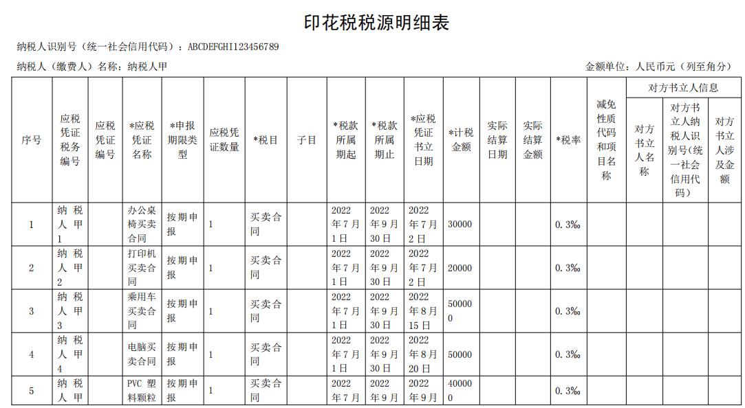 举例说明1:纳税人甲按季申报缴纳印花税,2022年第三季度书立买卖合同5份,合同所列价款(不包括列明的增值税税款)共计100万元,书立建筑工程合同1份,合同所列价款(不包括列明的增值税税款)共计1000万元,书立产权转移书据1份,合同所列价款(不包括列明的增值税税款)共计500万元。该纳税人应在书立应税合同、产权转移书据时,填写《印花税税源明细表》,在2022年10月纳税申报期,进行财产行为税综合申报,具体如下: