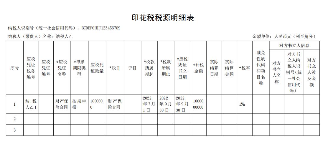 举例说明2:纳税人乙按季申报缴纳印花税,2022年第三季度书立财产保险合同100万份,合同所列保险费(不包括列明的增值税税款)共计100000万元。该纳税人应在书立应税合同时,填写《印花税税源明细表》,在2022年10月纳税申报期,进行财产行为税综合申报,具体如下: