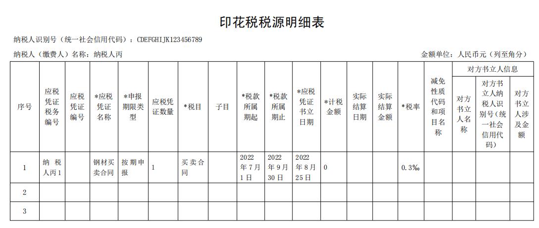 举例说明3:纳税人丙按季申报缴纳印花税,2022年8月25日书立钢材买卖合同1份,合同列明了买卖钢材数量,并约定在实际交付钢材时,以交付当日市场报价确定成交价据以结算,2022年10月12日按合同结算买卖钢材价款100万元,2023年3月7日按合同结算买卖钢材价款300万元。该纳税人应在书立应税合同以及实际结算时,填写《印花税税源明细表》,分别在2022年10月、2023年1月、2023年4月纳税申报期,进行财产行为税综合申报,具体如下: