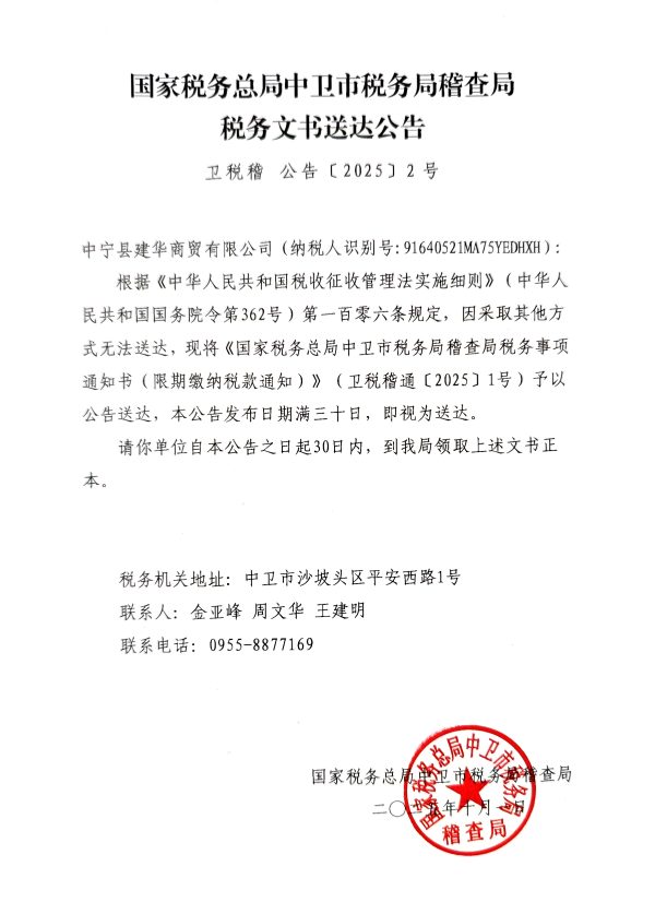 根据《中华人民共和国税收征收管理法实施细则》第一百零六条规定,国家税务总局中卫市税务局稽查局因采用其他送达方式无法向中宁县建华商贸有限公司送达税务文书,现公告送达,自公告之日起30日内到我局领取文书,逾期视为送达。