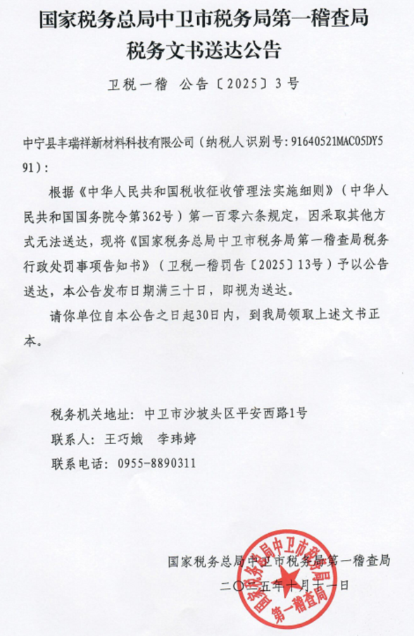 根据《中华人民共和国税收征收管理法实施细则》第一百零六条规定,国家税务总局中卫市税务局第一稽查局因采用其他送达方式无法向中宁县丰瑞祥新材料科技有限公司送达税务文书,现公告送达,自公告之日起30日内到我局领取文书,逾期视为送达。